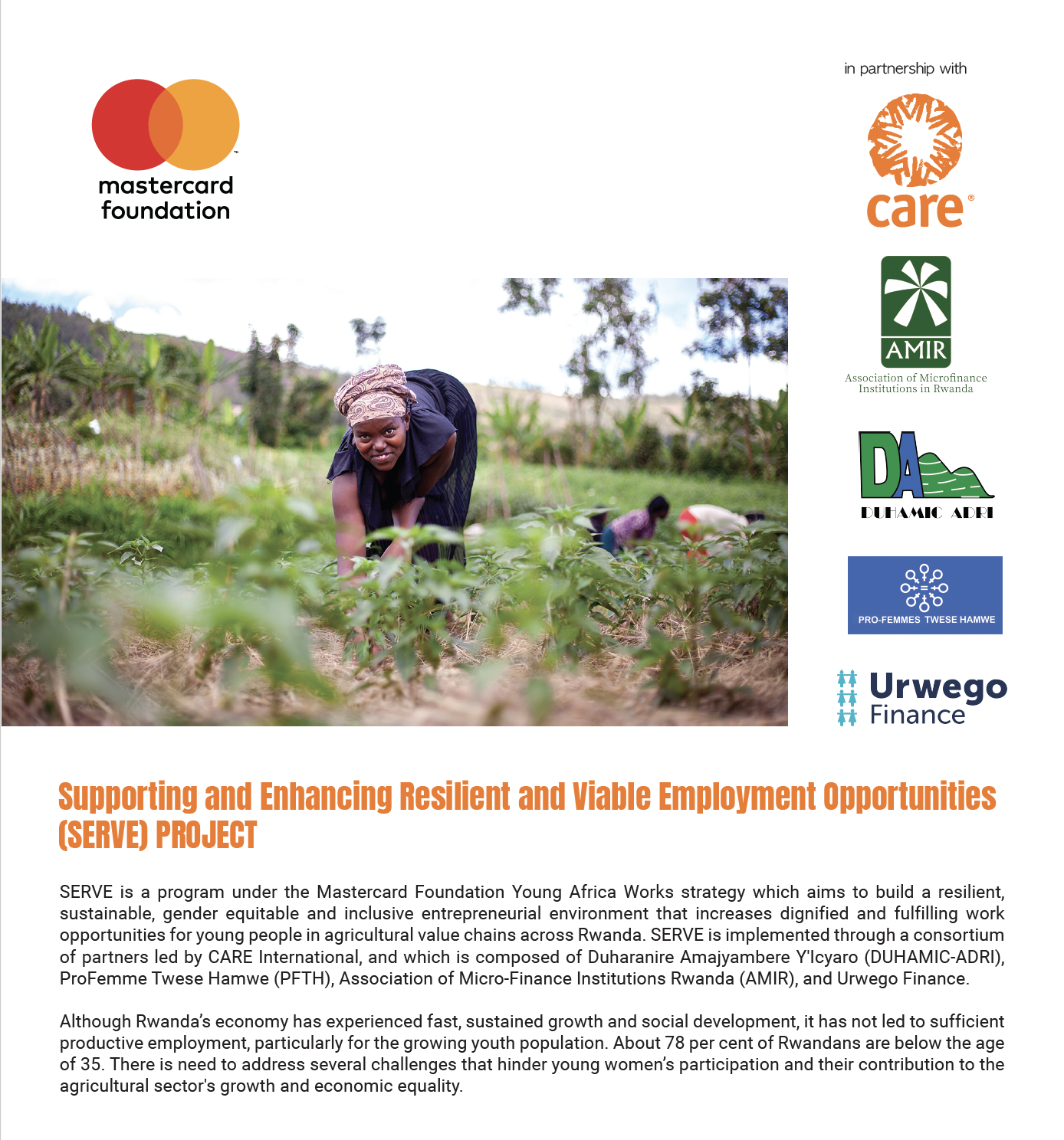 The SERVE project brief gives a highlight on SERVE project. SERVE is a 5-years (2023-2027) program funded by the Mastercard Foundation under its Young Africa Works strategy which aims to create and sustain 80,000 dignified and fulfilling work opportunities for predominantly female youth.